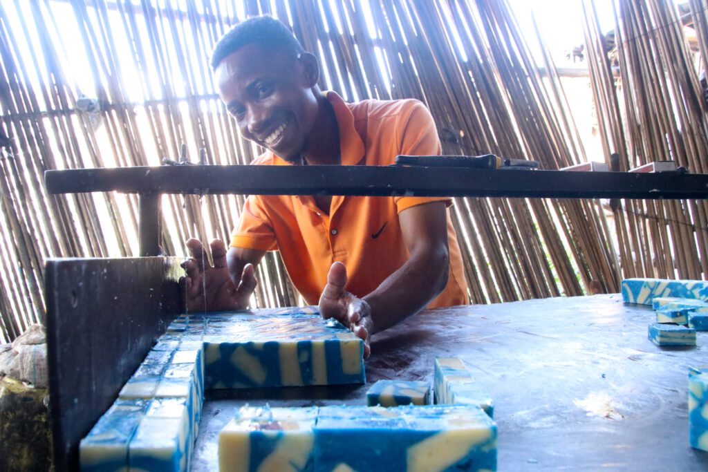 Manasse has a bachelor’s degree in Economics but struggled to find a job in Burundi’s unfavourable employment market. He turned to entrepreneurship because he wanted: “to become a job creator, instead of a job seeker”. He teamed up with three other young men and they invested their savings to launch the Ishaka soap-making business. The team collects and dries palm nuts, then grinds them to obtain the palm nut oil. The palm oil is then used to produce soap. On average, Ishaka produces 6,000 kg of soap per month and they sell the totality of their produce.